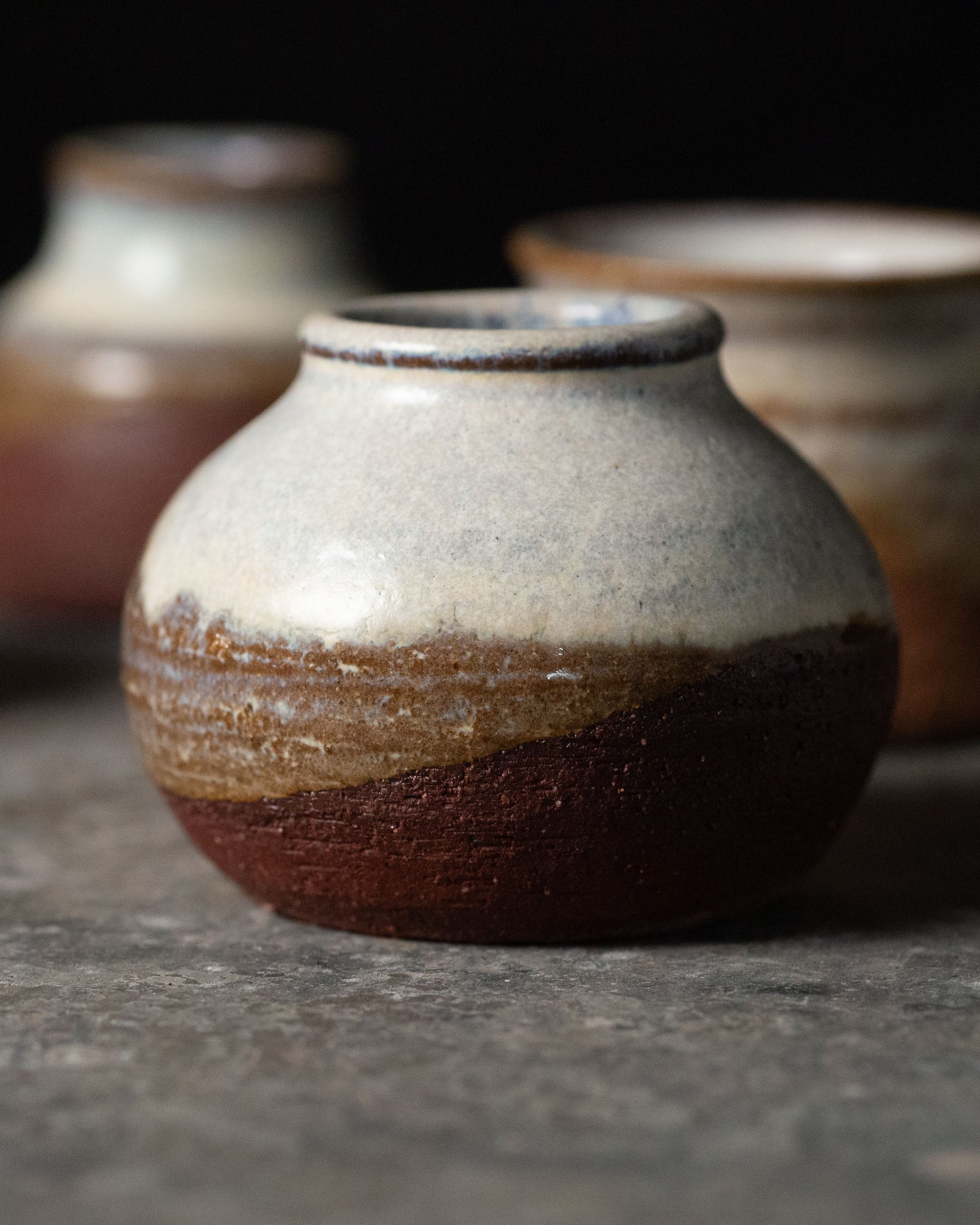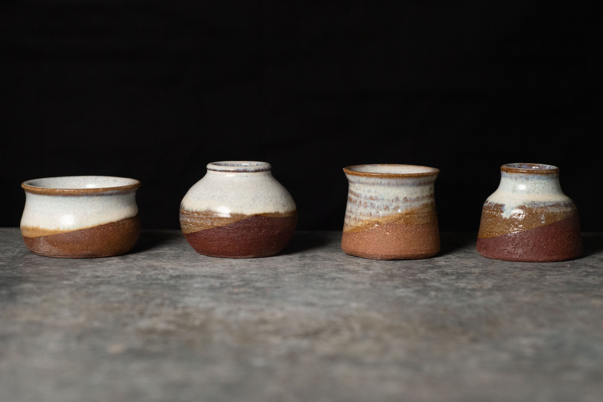 A set of 4 small vessels intended as shot glasses. A whimsical take on various potion bottle forms.