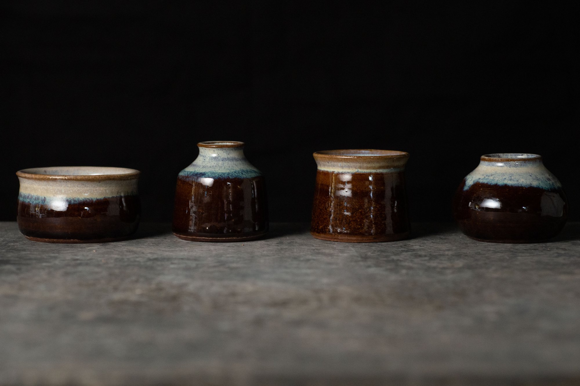 A set of 4 small vessels intended as shot glasses. A whimsical take on various potion bottle forms.